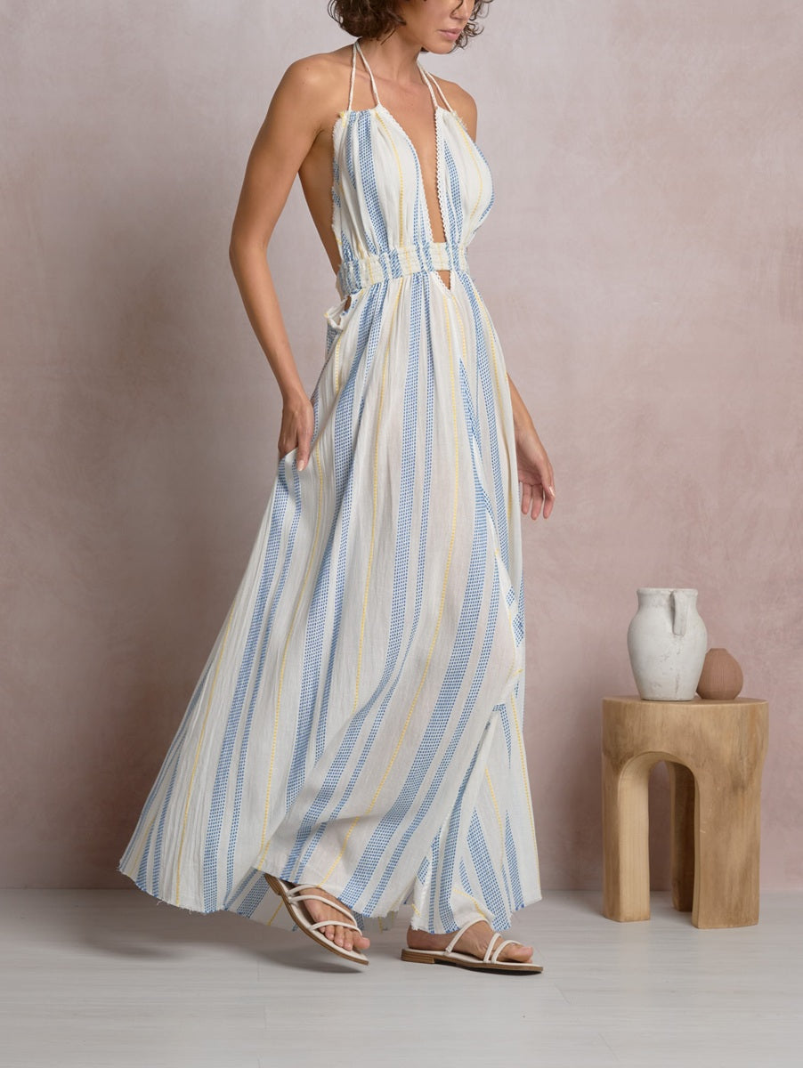 The dramatic deep V-neckline and daring side cutouts create a sultry, sun-ready silhouette, while the lightweight, flowy fabric ensures you stay cool from the boardwalk to the bistro. Whether you’re layering it over your favorite bikini as a high-end cover-up or wearing it solo for a seaside dinner, this dress is your new vacation essential.
