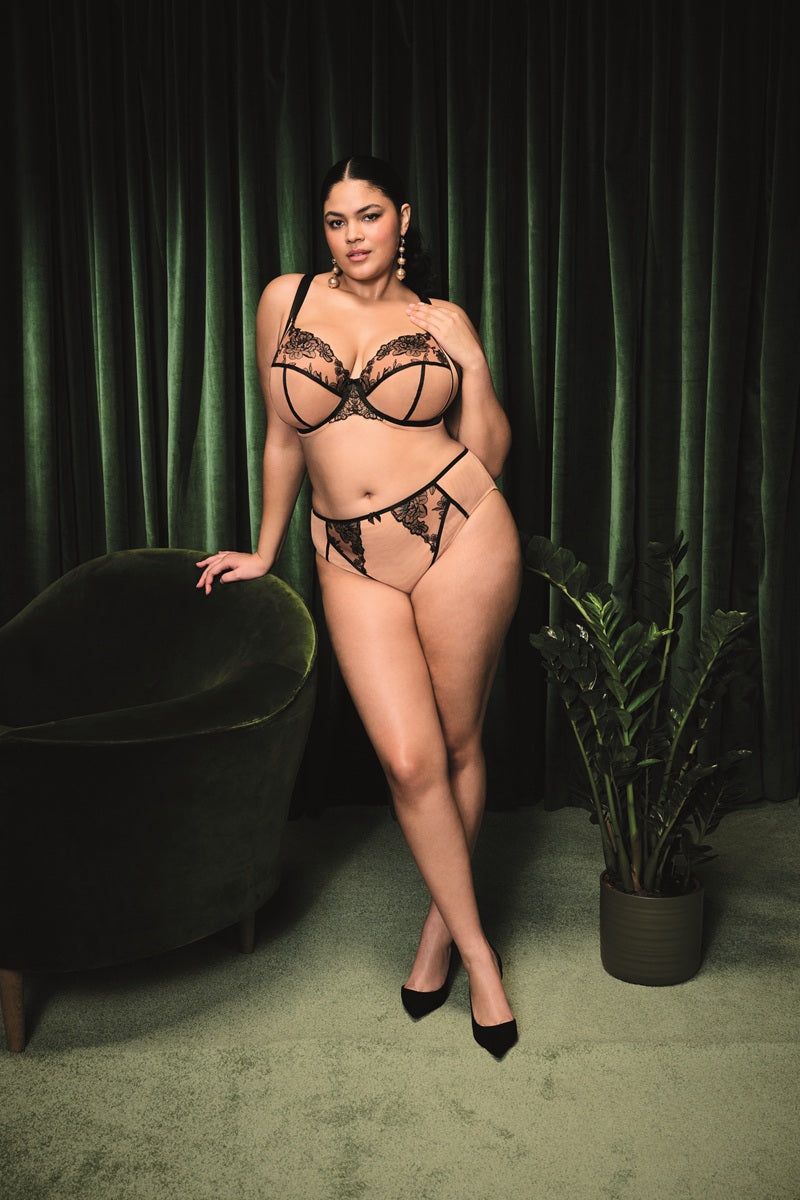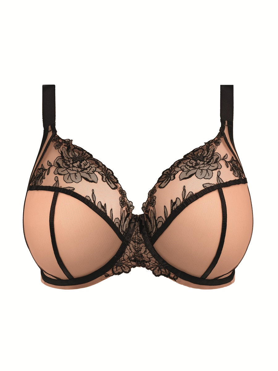 Inspired by our iconic Matilda Bra, Elomi’s Teagan Plunge Bra delivers sultry sophistication with a side of sass in our Café Au Lait colorway. The top cups and center gore have been precision printed with embroidered floral drama, glistening with soft metallic yarn. Plus, smooth satin-look elastics and seamless wire overlays create a luxe finish, while the little bow at the center front adds a flirty finishing touch.
