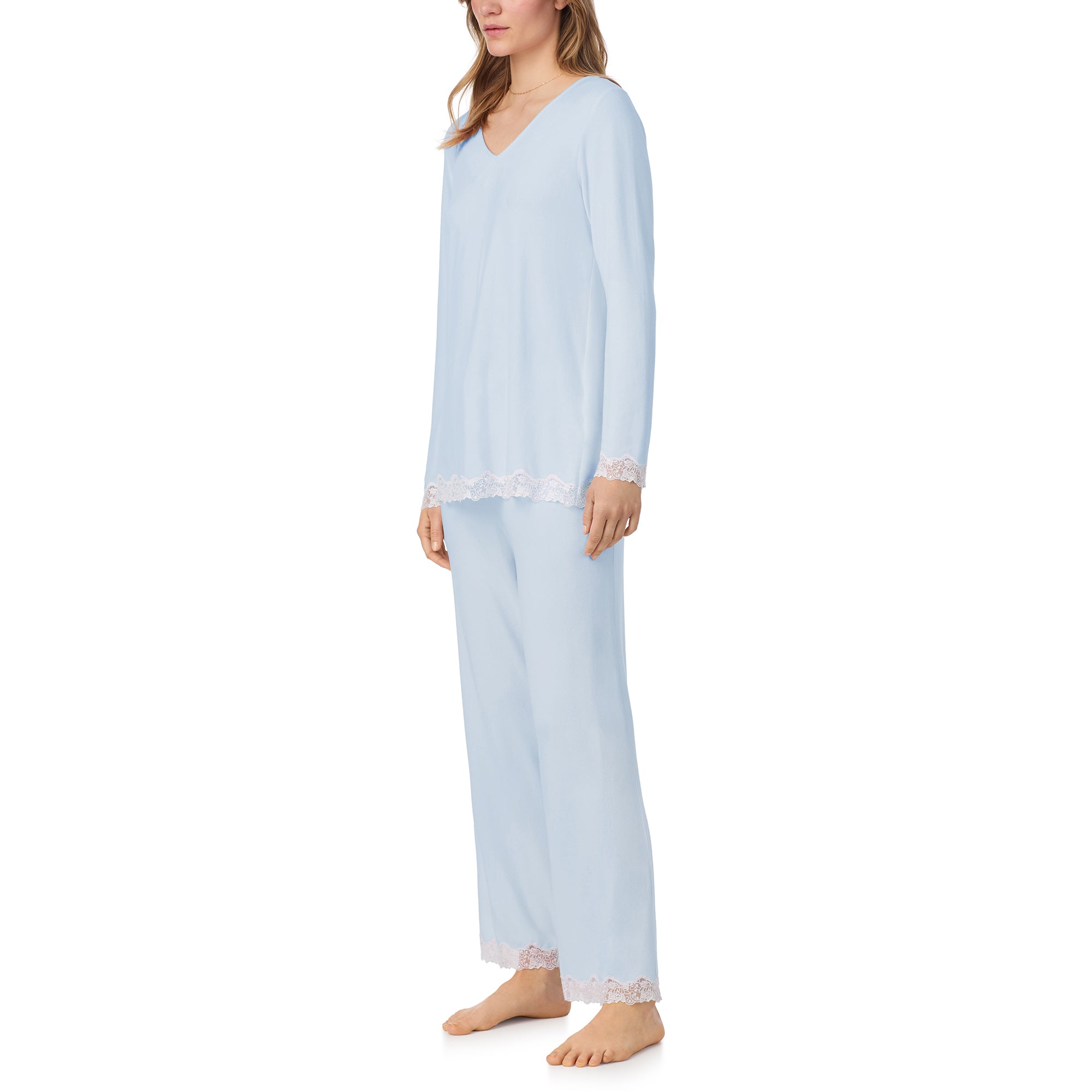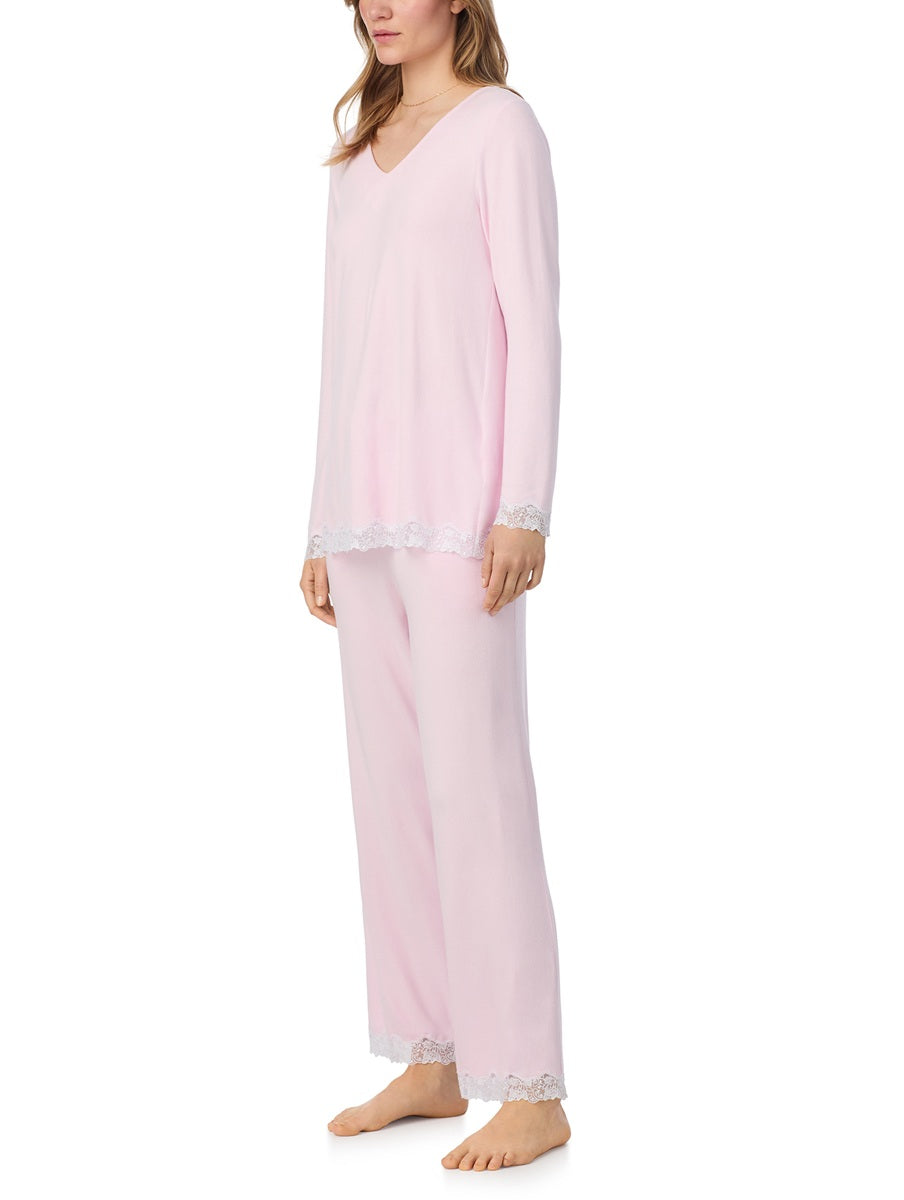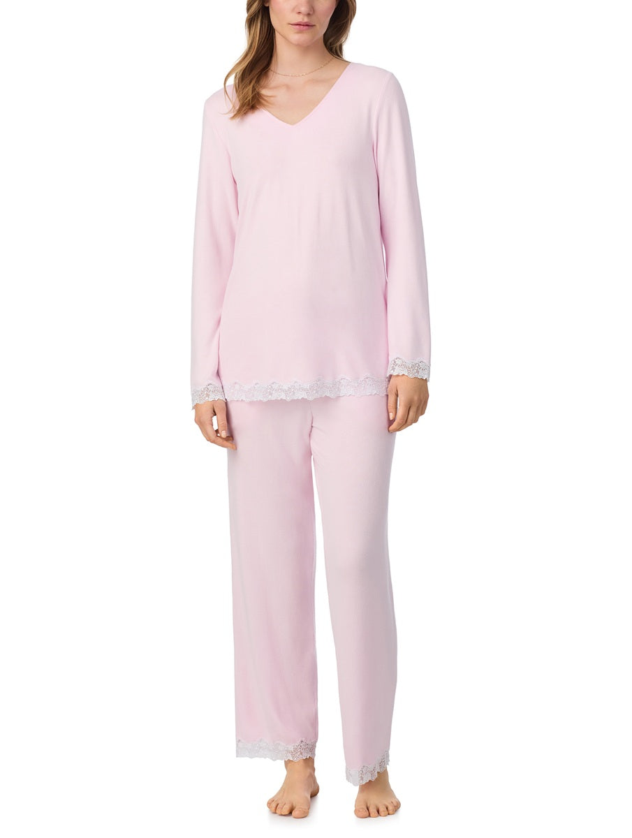 This soft sweater knit PJ set is designed in both a blue and a pink. The top features a V-neckline, gorgeous 2" embroidered lace-trimmed sleeve openings and hemline. The matching long bottom has an elastic waist with drawcord and side seam pockets. It is finished with the exquisite embroidered lace on the leg openings.