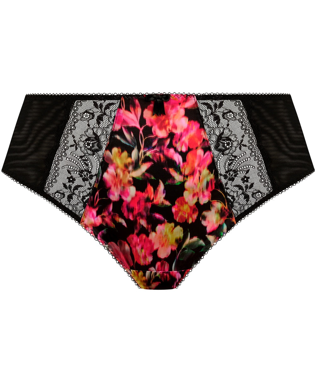 Feel fabulous in Elomi's Morgan High Leg Brief in our bold and playful Hot House colorway. The vibrant, blurred botanical print takes center stage while the stretch lace back leg panels add a flirty, modern twist. For comfort and confidence, the back and side front panels are made from double layer stretch mesh, keeping things smooth and modest. Finished with a sweet bow detail at the center front, this brief pairs perfectly with our matching Morgan Stretch Banded Bra.