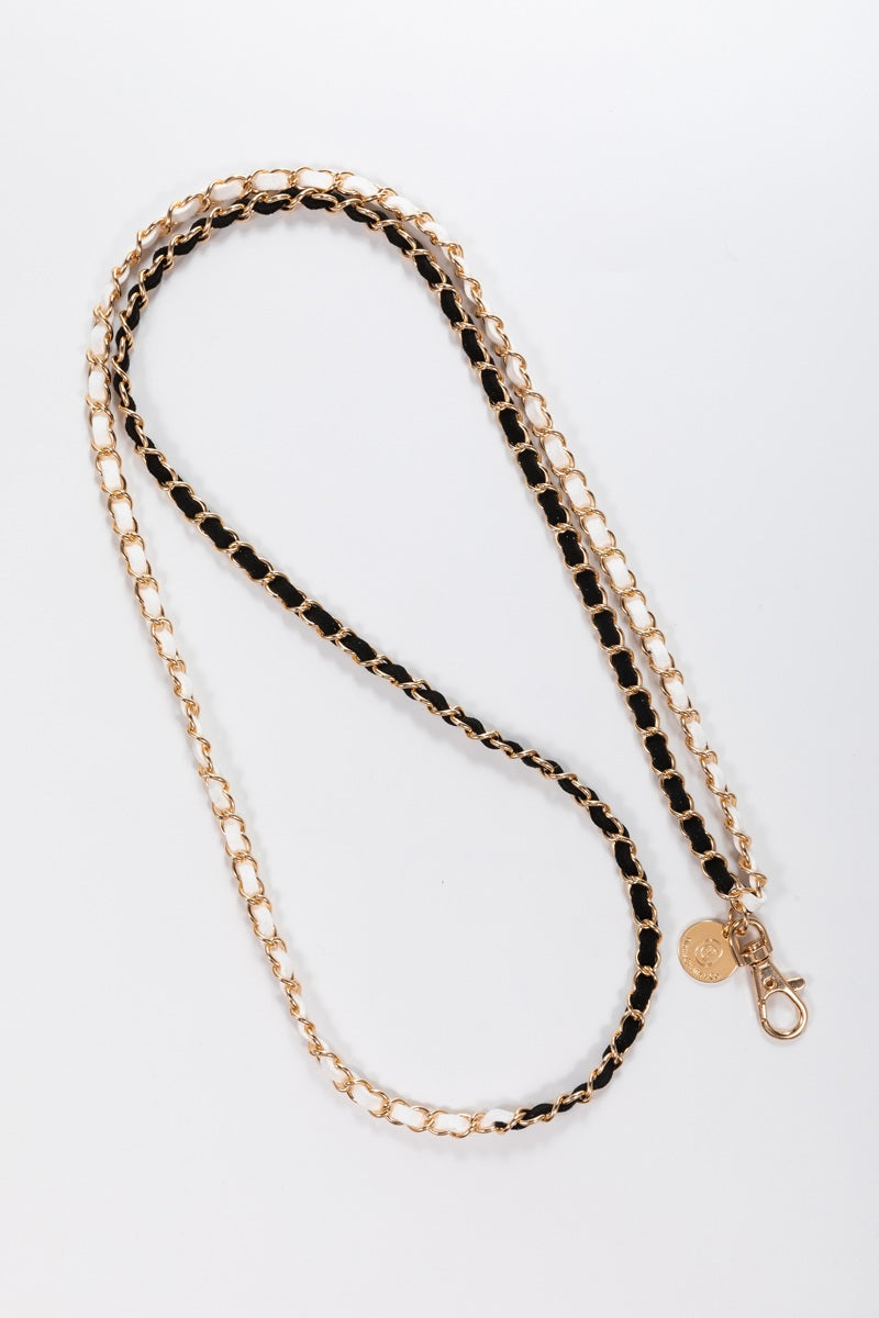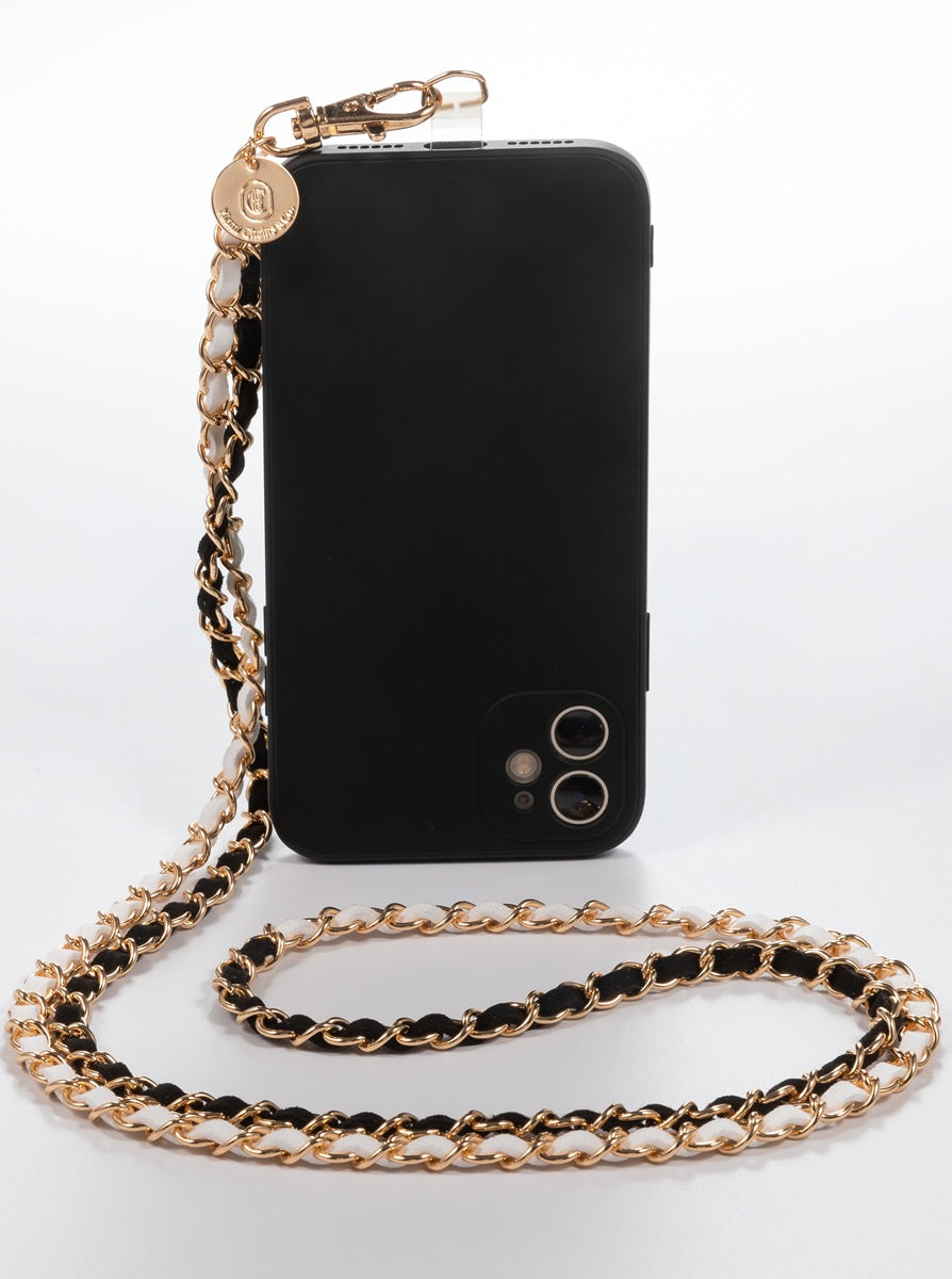 Gold Plated Crossbody Phone Chain with Two Tone 100% Black & White Suede Woven Throughout. With Phone Chains this chic, there has never been a more convenient, lightweight, and fashionable way to keep your phone with you; hands-free.