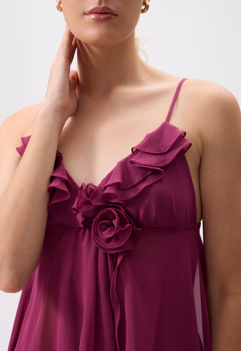 Spark sensuality and playfulness with the Charleston Babydoll. It's flirty neckline ruffles and fabric rosette, cascade and accentuate the body. This overlapping skirt intentionally covers, while it's peak-a-boo length reveals its complimentary chiffon panty. This timeless babydoll will be the initiator of iconic memories.