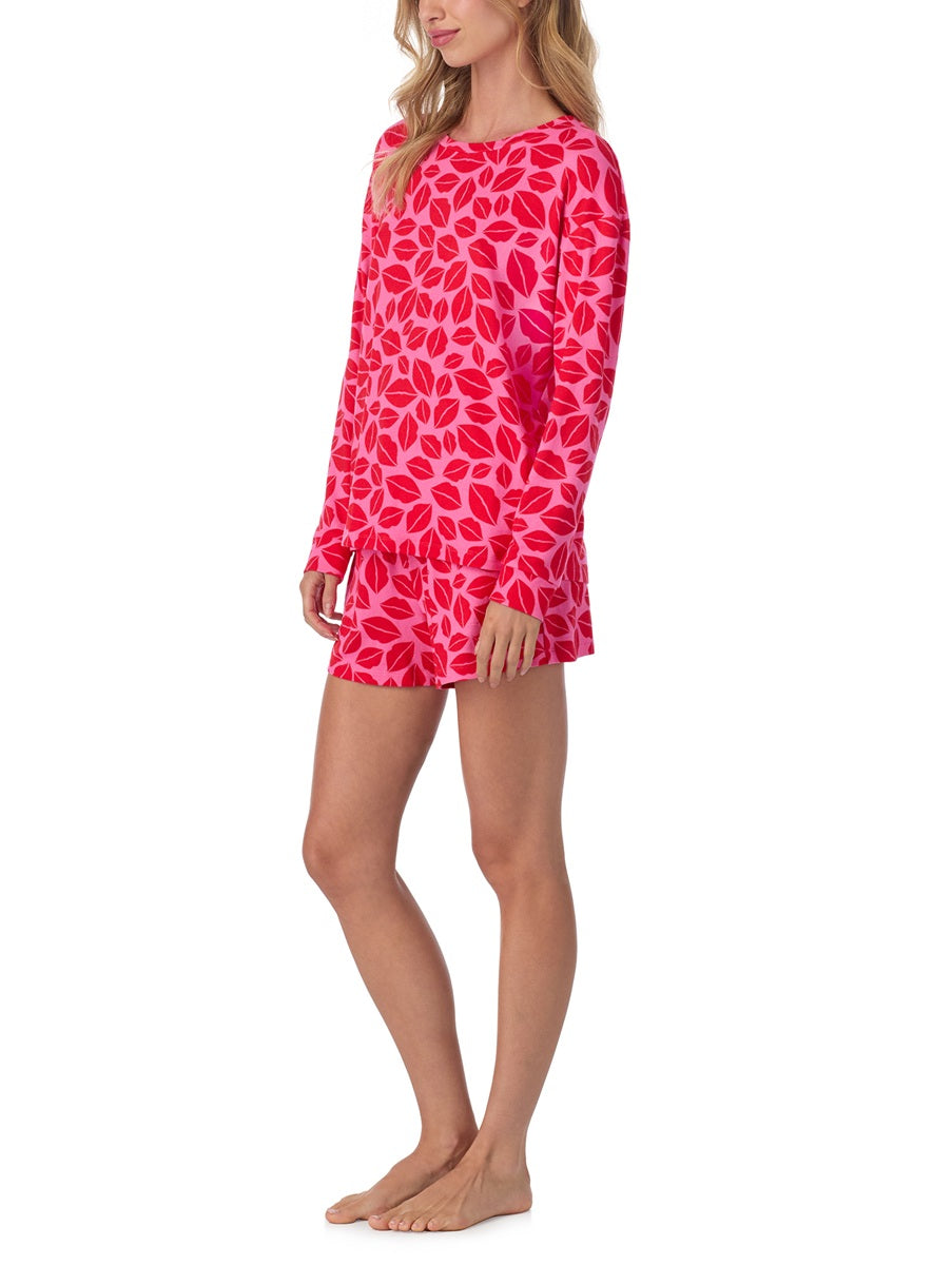 Get cozy with a kiss of fun. The Room Service Perfect Pout PJ Set brings playful charm and all-night comfort together in one irresistible duo. Made from ultra-soft jersey knit, this long sleeve and short set features a bold pink-and-red lip print that’s perfect for lounging, sleeping, or gifting. The relaxed fit keeps things comfy, while the elastic waistband and lightweight feel make it easy to wear year-round.