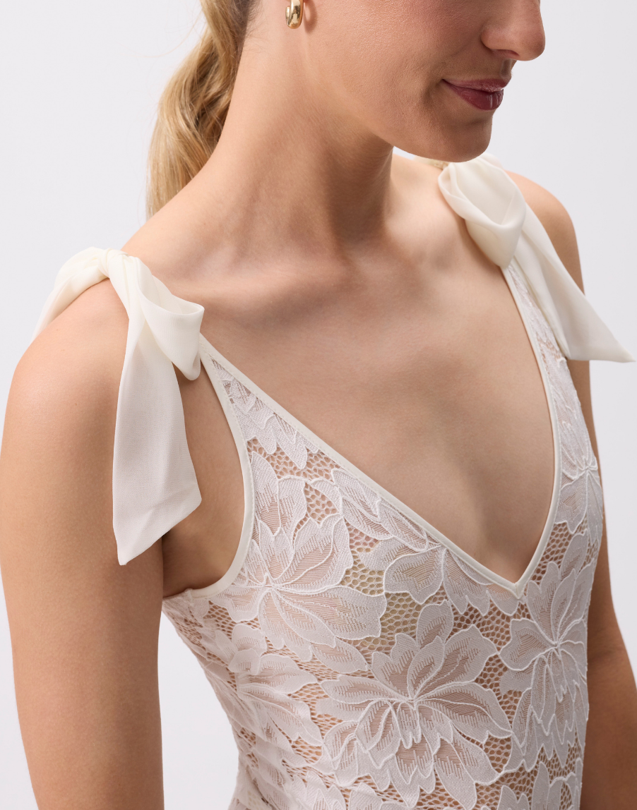 Buttery-soft and ultra-flattering, this romantic stretch lace bodysuit is a must-have. Features a flattering v-neck, curved back cut out, chiffon bows, adjustable spaghetti straps and a snap closure. Wear the Amour Teddy for those seductive moments, and dare to style it for date night out.
