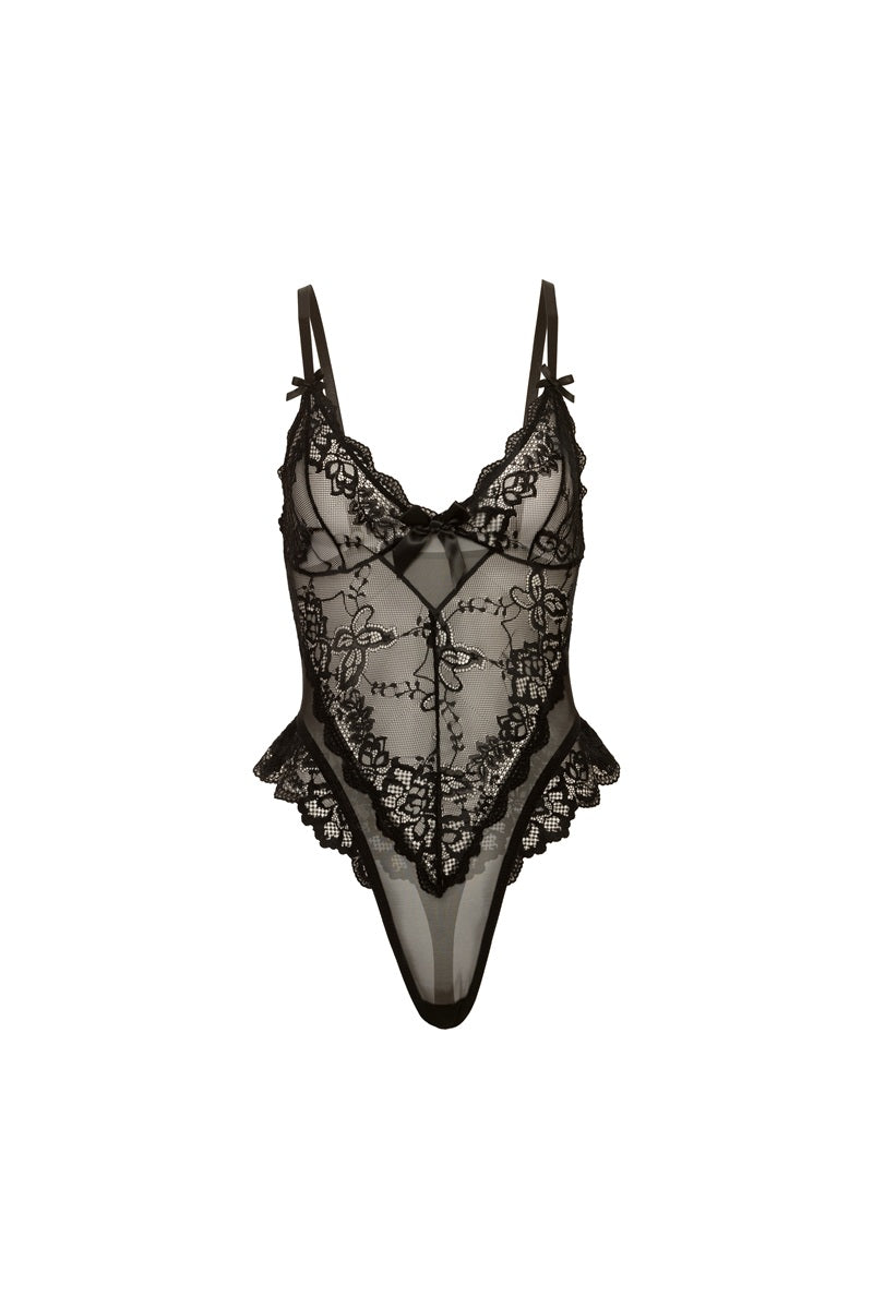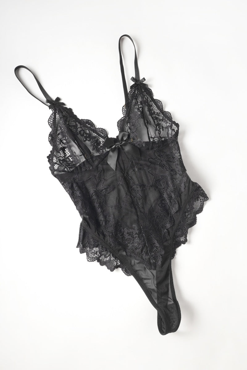 Turn up the romance with this sultry sheer lace bodysuit designed to hug your curves in all the right places. Delicate floral lace, flirty bow details, and a daring thong back makes this piece irresistible.