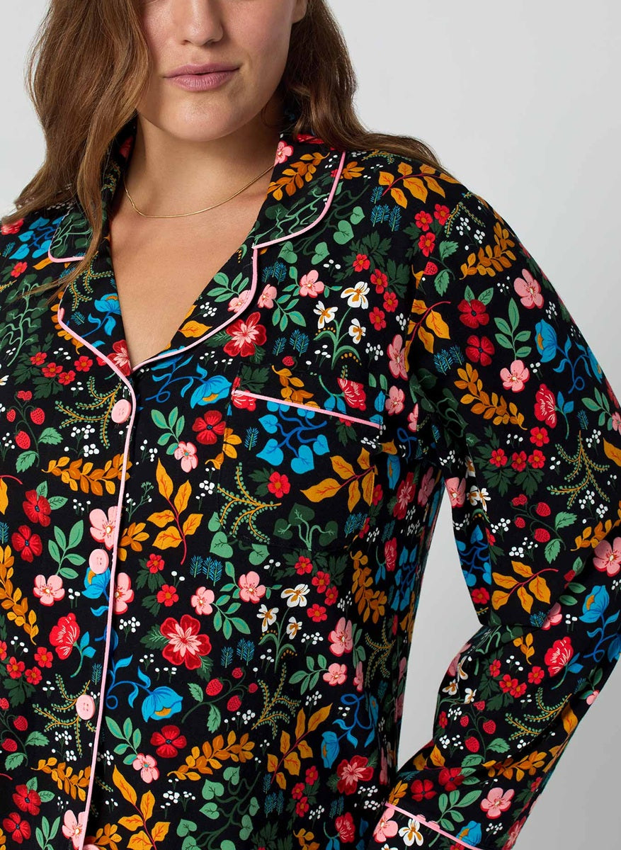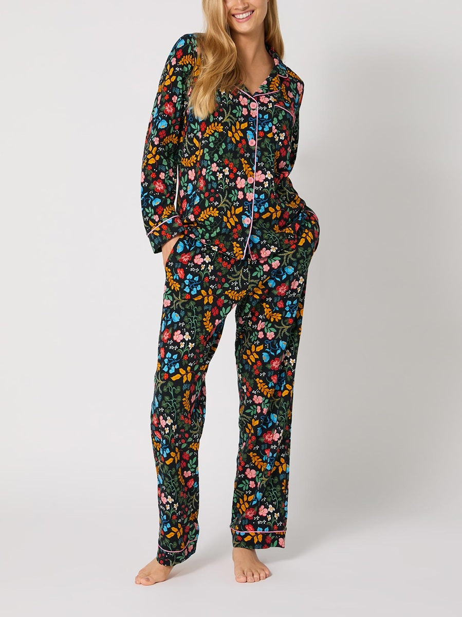 Wrap yourself in cozy comfort and timeless charm with the Bed Head Winter Blooms Pajama Set. Featuring a vibrant floral print on a rich, dark background, this classic two-piece set brings a touch of luxury to your bedtime routine. The button-up long-sleeve top and relaxed-fit pants are soft and cozy for all-night comfort. Thoughtful details like contrast piping and a notched collar add a refined finish, making these pajamas as stylish as they are comfortable.