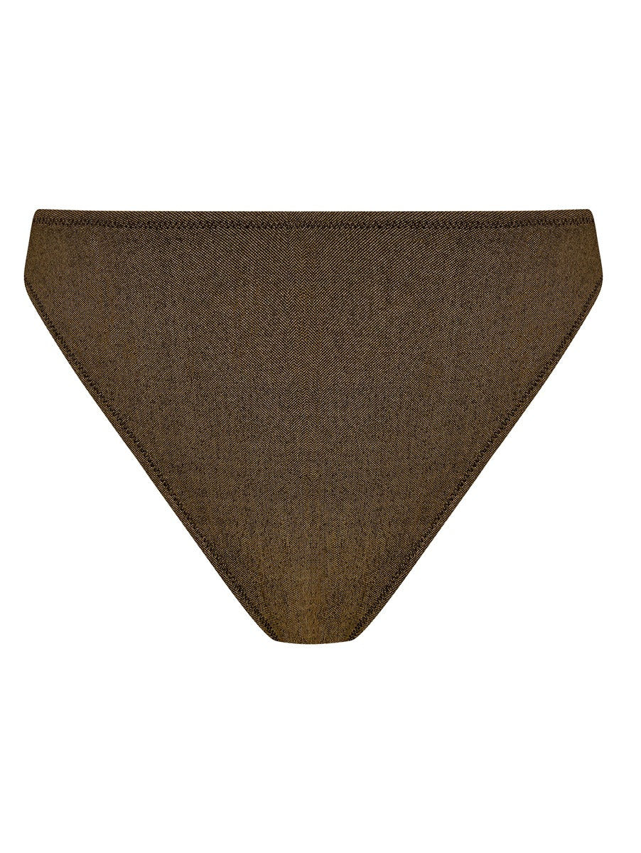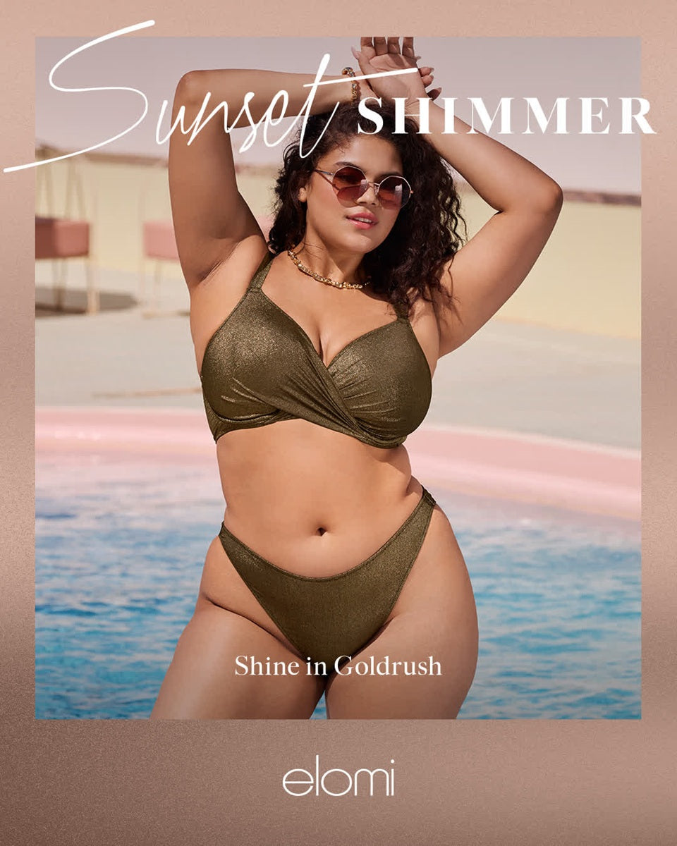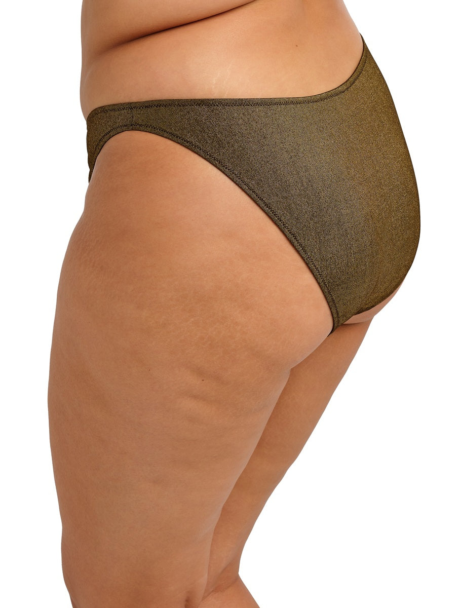 Radiate confidence in Elomi's Sunset Shimmer High Leg Bikini Brief in our Gold Rush colorway. Crafted from shimmering stretch fabric woven with soft metallized yarns, this golden beauty reflects the light like liquid sunshine, bringing instant glamour to every poolside moment. The high leg cut elongates your silhouette for a sleek, leg lengthening effect, while the lined front ensures a smooth, comfortable fit that feels as good as it looks. Designed to pair perfectly with our Sunset Shimmer Plunge Bikini Top, it's the ultimate blend of sparkle, sophistication and unapologetic style.