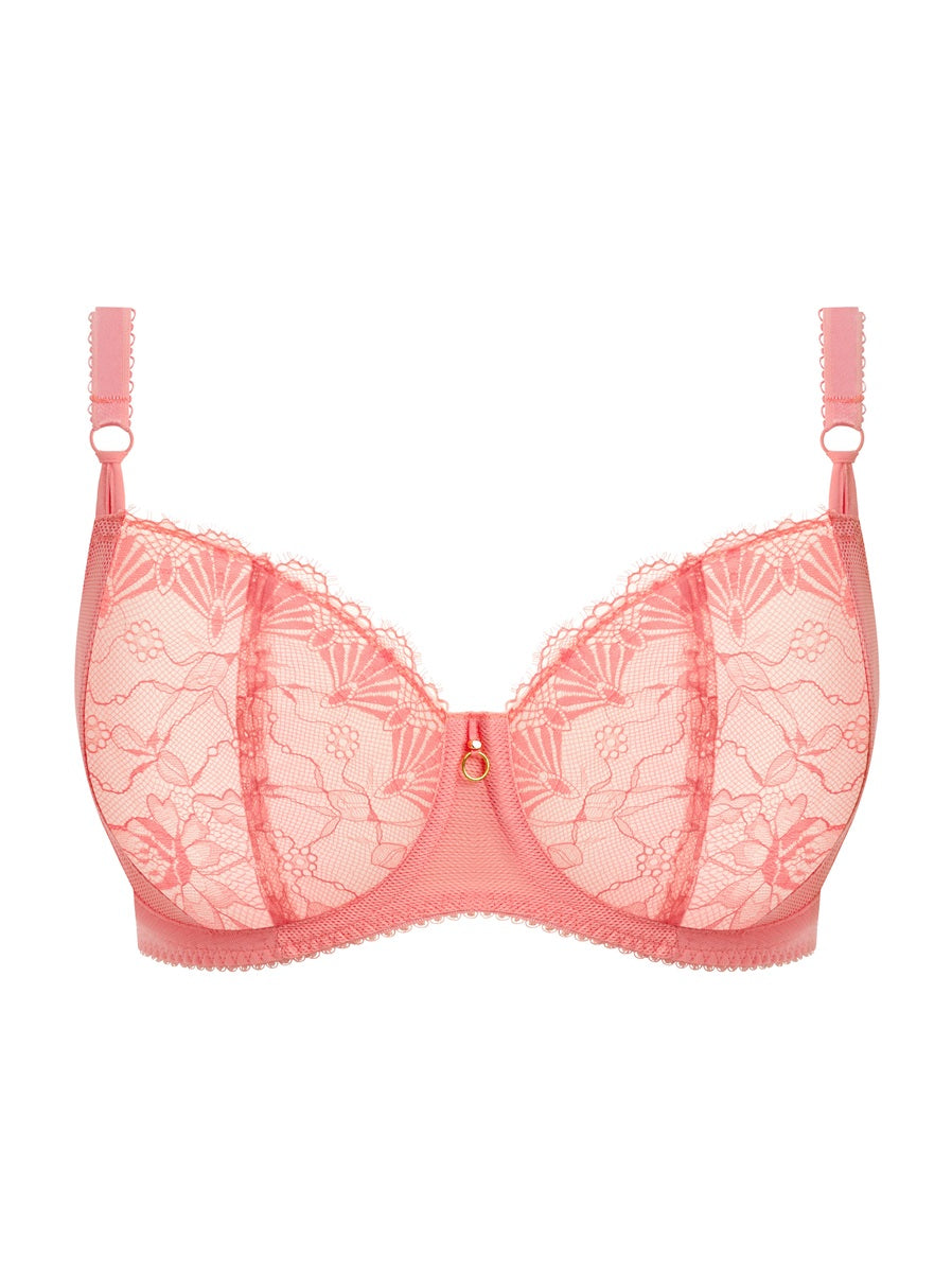 Summon summer months with Freya's Fascinate Balconette Bra in our soft Peach hue. Intricate floral lace meets semi-sheer mesh for a look that’s light, airy, and undeniably feminine. Eyelash lace outlines the neckline, adding a subtle touch of texture, while the balconette shape enhances your natural silhouette with gentle lift and flattering support.