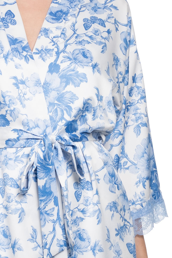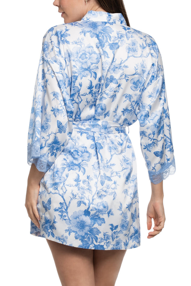 Blue/ivory floral print kimono in a stretch satin fabric. Blue lace adorns the sleeve at the bottom. This elegant short robe combines comfort with timeless style, perfect for lounging or layering. The soft satin drapes beautifully while the delicate lace trim adds a touch of sophistication.