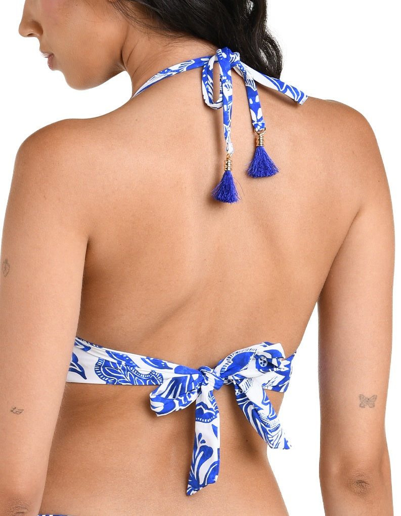 This Banded Halter Top from our Botanical Brocade Collection features a deep V-plunge neckline with a wide band underneath and halter straps that draw the eyes upward while balancing your shoulders. Adjustable straps that tie around the back are finished with tassels.