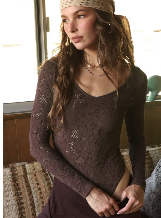 Nikibiki French Roast Lace Textured V Neck Bodysuit 8436