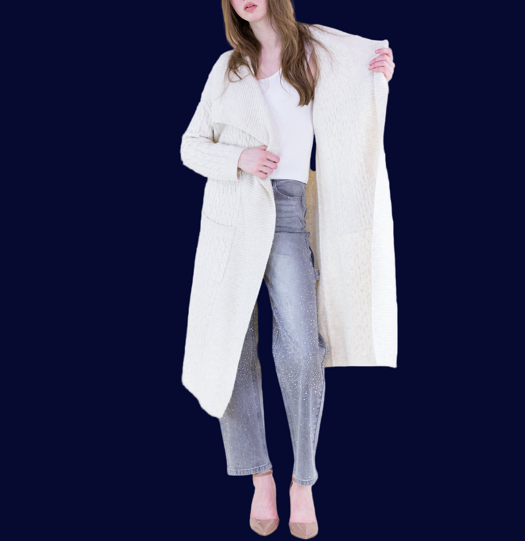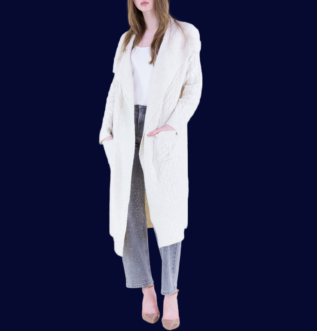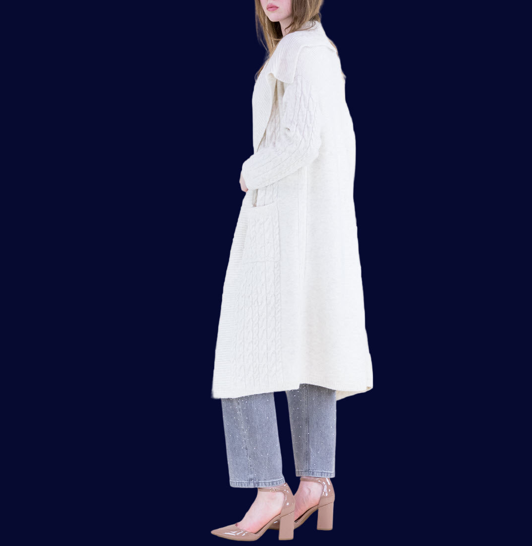 Discover effortless elegance with this luxurious oversized coatigan, designed to become your go-to layering essential. Featuring a flattering long-line silhouette and relaxed open front, it drapes beautifully over any outfit for instant sophistication. The intricate cable stitch ribbed pattern adds visual interest and texture, while the cozy shawl collar frames your face with timeless style.